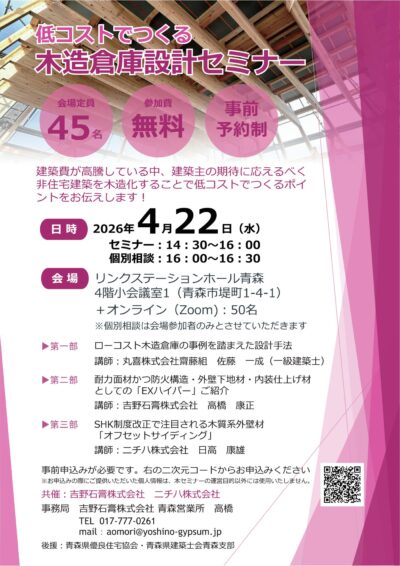 【参加無料】(設計者向け)低コストで実現する木造倉庫設計セミナー開催のお知らせ(4/22 青森・オンライン同時開催)